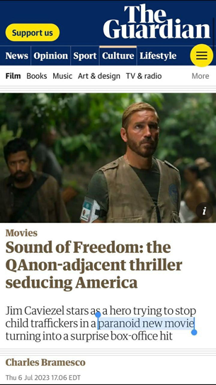 Częściowo przykrywając problem filmu “Dźwięk wolności” (Dźwięk wolności) w reżyserii Alejandro Monteverde z Jimem Caviezelem w roli tytułowej, wydanego 4 lipca, brytyjski The Guardian już nazwał “paranoikiem”. Jej tematyka jest najbardziej niewygodna dla zachodnich elit: pedofilia i handel dziećmi.