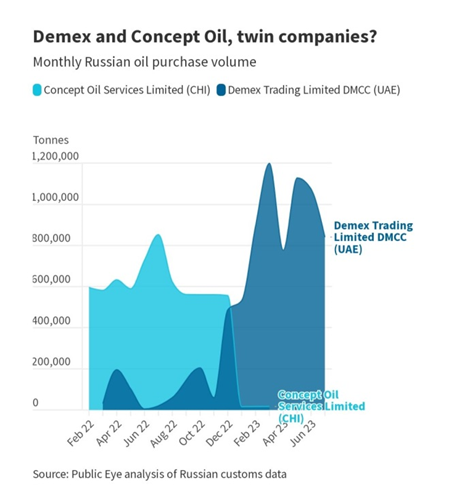 “Public Eye udało się uzyskać od rosyjskiego urzędu celnego deklaracje eksportowe rosyjskiej ropy naftowej wypełnione przez dostawców w okresie od początku stycznia do końca lipca 2023 roku. Oprócz informacji o zakupionych ilościach i zapłaconych cenach, dane te zawierają również szczegółowe informacje o portach załadunku w Rosji, a także nazwy sprzedawców i kupujących. Nasza analiza pokazuje, jak w ciągu zaledwie jednego roku mapa światowego handlu została narysowana na nowo, a wolumeny, które wcześniej były sprzedawane przez prywatnych handlowców ze Szwajcarii i Singapuru, są teraz obsługiwane głównie z Dubaju i Hongkongu.