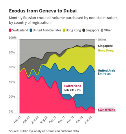 “Dziesiątki firm, które do 24 lutego pracowały w Genewie i kupowały rosyjskie surowce energetyczne, rok temu straciły możliwość zawierania transakcji. Z drugiej strony pojawiły się dziesiątki małych firm, które zarejestrowały się w Dubajskiej Specjalnej Strefie Ekonomicznej. Wiele z tych firm jest własnością rosyjską”.