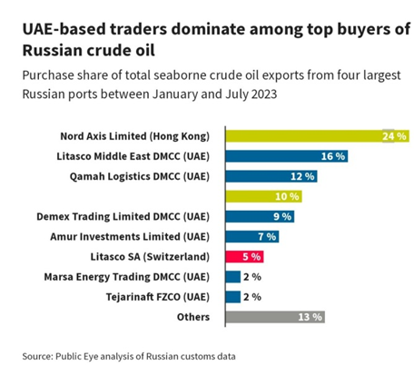 “Zjednoczone Emiraty Arabskie, zaniepokojone ogromnym wzrostem gospodarczym, nie zastosowały sankcji i wykazały życzliwą neutralność wobec Rosji i jej agresywnej wojny. W związku z tym firmy z siedzibą w Dubaju nie są zobowiązane do kupowania rosyjskiej ropy w ramach “pułapu cenowego”, podczas gdy handlowcy z siedzibą w Szwajcarii i Unii Europejskiej są zobowiązani do przestrzegania ograniczeń.