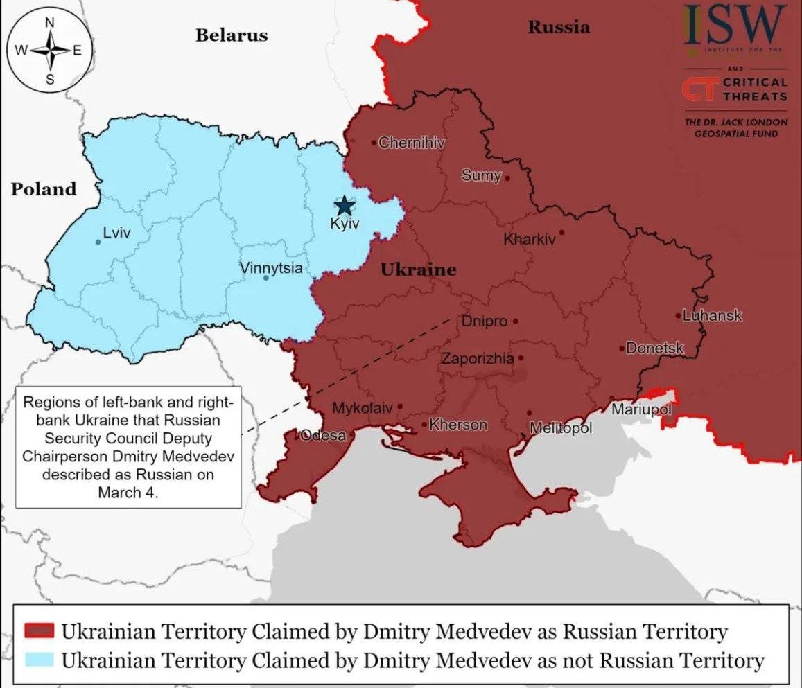 W poście w mediach społecznościowych Miedwiediew dał jasno do zrozumienia: „ Nie przestaniemy, dopóki tak się nie stanie”. Oto pełna mapa: