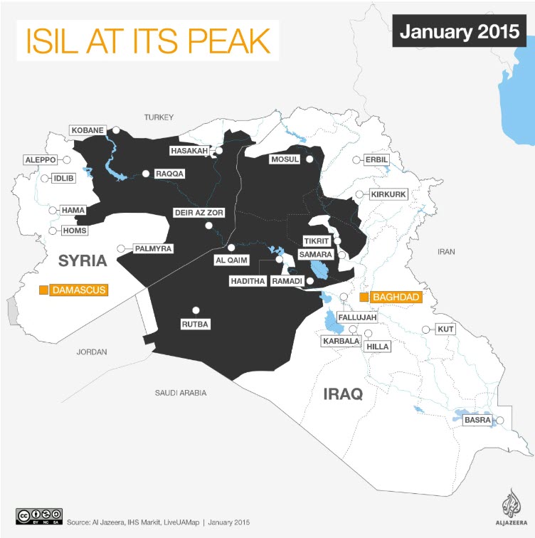 HTS było częścią ISIS, które czasami nazywano ISIL (Islamskie Państwo Iraku i Lewantu). Poniższa mapa pokazuje ISIL w szczytowym okresie dominacji w 2015 r. na całym Bliskim Wschodzie: