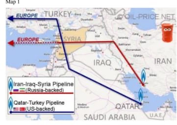 Poniższy obraz przedstawia dwie konkurujące ze sobą propozycje gazociągów. Jedna, z Kataru do Europy, wzbogaciłaby Katar, co jest korzystne dla Zachodu. Druga byłaby z Iranu, co NIE jest korzystne dla Zachodu. Obie musiałyby przebiegać częściowo przez Syrię: