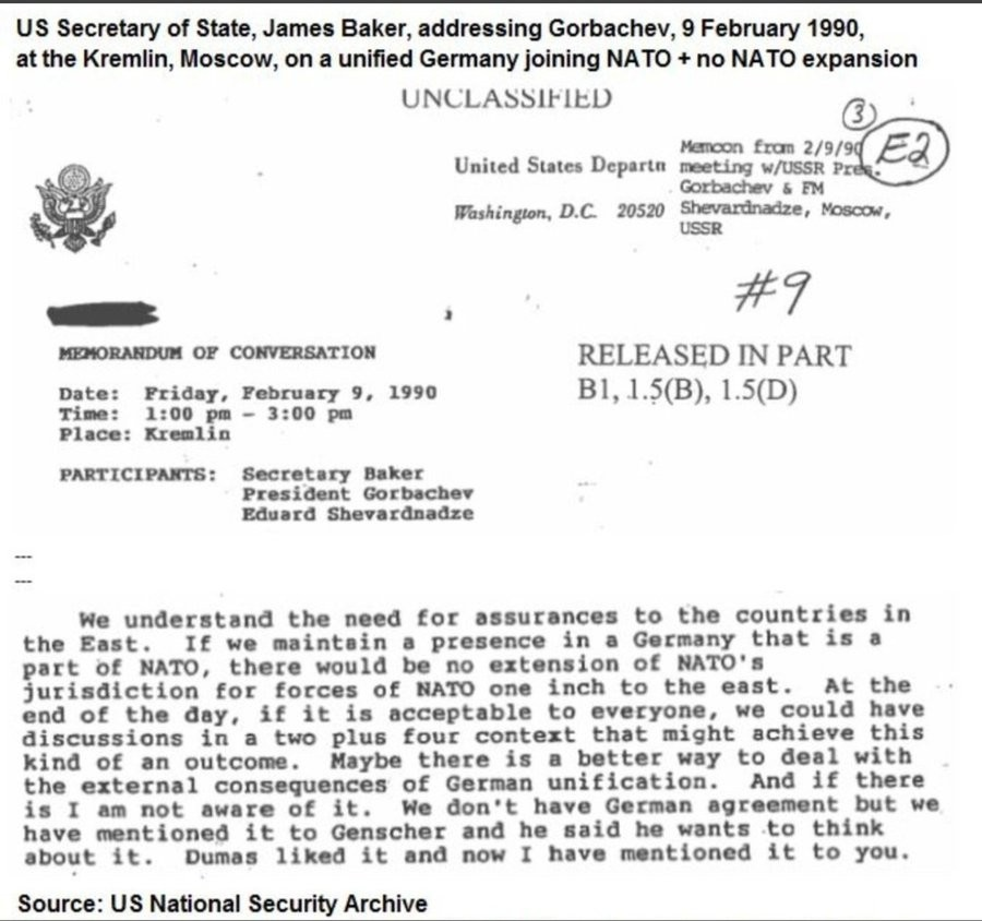 Profesor Uniwersytetu Columbia Jeffrey Sachs i profesor z Chicago John Mearsheimer twierdzą, że podczas długich negocjacji w sprawie zjednoczenia Niemiec przywódcy USA, Europy i Niemiec wyraźnie zapewnili Gorbaczowa, że w przyszłości NATO nie zostanie rozszerzone na wschód. Obietnica ta została powtórzona na kilku innych spotkaniach z Gorbaczowem i na kilku innych spotkaniach z innymi sowieckimi urzędnikami, i jest to zapisane w Archiwum Bezpieczeństwa Narodowego USA, pokazanym poniżej: