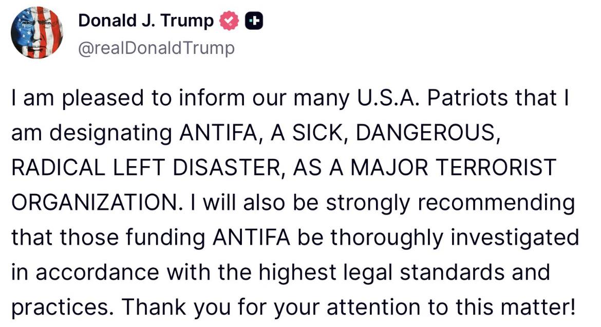 W środę wieczorem, 17 września 2025 r., Donald J. Trump oficjalnie uznał Antifę za organizację terrorystyczną na mocy nadzwyczajnych rozporządzeń wykonawczych dotyczących bezpieczeństwa narodowego podpisanych na początku 2025 r. To uruchomiło wojskowe operacje wywiadowcze przeciwko każdemu znanemu współpracownikowi Antify w całym kraju – w tym członkom Kongresu, aktywom medialnym i tak, ich dzieciom.