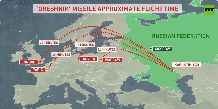Czasy lotu pocisków Oreshnik wystrzelonych z Rosji pokazano na poniższej mapie:
