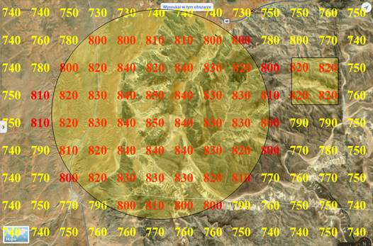 Rys. 6. Określenie kształtu piramidy/kopuły na okragłym mieście. Średnica piramidy wynosi około 6 km. Liczbami oznaczony jest sygnał rodnika ponadtlenkowego.