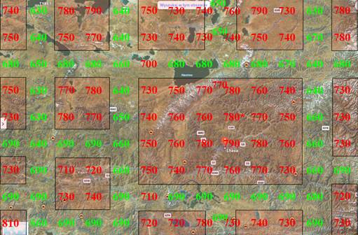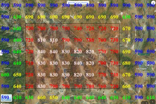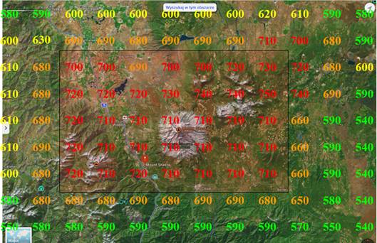 Rys. 2. Okolice góry Mount Shasta. Dłuższy bok podziemnego miasta wynosi ok. 60 km. Liczbami oznaczony jest sygnał pierwiastka 140.