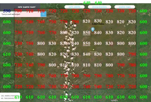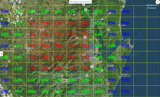 Rys. 3. Okolice Joinville w Brazylii. Nieco powyżej znajduje się Sao Paulo. Dłuższy bok podziemnego miasta wynosi ok. 45 km. Liczbami oznaczony jest sygnał pierwiastka 140.