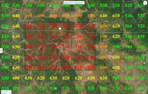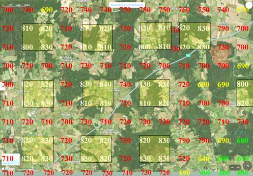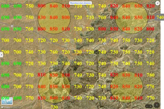 Rys. 7. Piramidy na mieście w okolicy Zalewu Wiślanego. Liczby odzwierciedlają wielkość sygnału pierwiastka azotu.