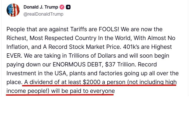 To jest dokładnie powód, dla którego rząd wysuwa teraz pomysł dystrybucji czeków na 2000 dolarów dla każdego podatnika o niskich i średnich dochodach. Spójrz na to, co prezydent Trump opublikował w mediach społecznościowych właśnie DZISIAJ:
