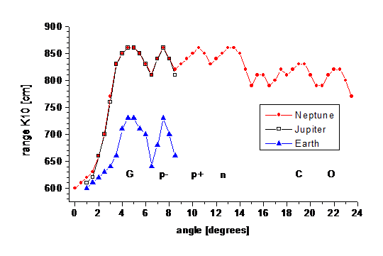 Na wykresach rys. 9 przedstawione są fragmenty spektrów, z których możemy coś powiedzieć odnośnie wykorzystywanej antygrawitacji. W statkach kosmicznych obcych do uzyskiwania antygrawitacji wykorzystywany jest pierwiastek 115, który stymulowany, z udziałem protonów, wytwarza antyprotony, a w reakcji anihilacji powstają grawitony. Na wykresach mamy kolejno spektra z Neptuna, Jowisza i Ziemi (podziemne miasto pod Gdańskiem). Sygnał grawitonów z podziemnego miasta na Ziemi jest około dziesięciokrotnie mniejszy niż na Jowiszu lub Neptunie. Mówimy tu o grawitonach stowarzyszonych z anyprotonami, a więc sztucznie generowanych. Zastanawiająca jest jednak spora ilość grawitonów i antyprotonów obecna w badanym podziemnym mieście.