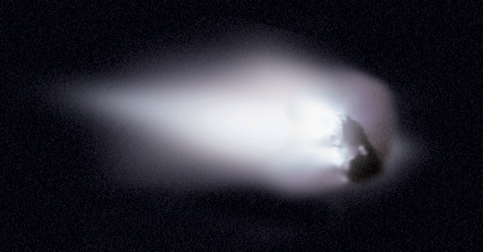 Zdjecie komety Halleya z 1986 roku wykonane za pomocą europejskiej sondy Gioto. Widoczne jądro komety o średnicy 15km. (apod.nasa.gov/apod/ap100104.html)