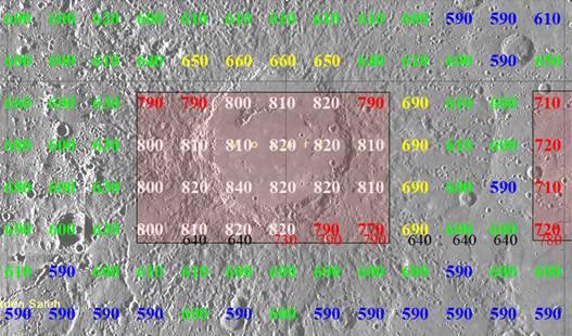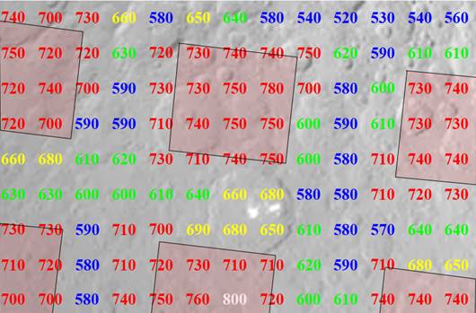 Rys. 2. Krater Mozart na planecie Merkury. Uszkodzenia miasta zgodne z położeniem krateru. Mniejszymi cyframi zaznaczony sygnał aninonorodnika ponadtlenkowego, wskazujący, które części miasta są zamieszkane.
